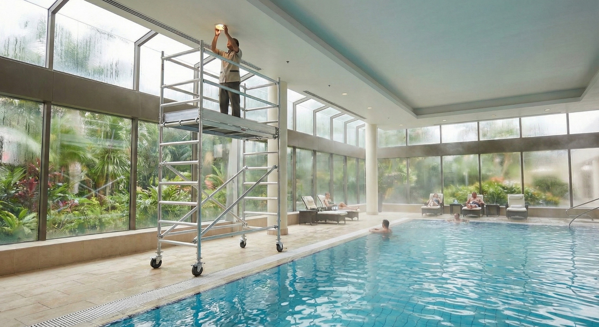 The Aluminium Advantage from Indoor Innovations eliminates this costly cycle. Aluminium creates its own protective oxide layer, making it naturally immune to the corrosive effects of moisture and chlorine. These towers can be erected directly at the poolside (or even partially submerged for wall repairs) without any risk of structural degradation or water staining. This allows hotel facility managers to perform "live maintenance," fixing lights or ventilation ducts while the pool remains operational. In a high-occupancy market, the ability to avoid "Facility Shutdowns" translates directly into preserved revenue and guest satisfaction.